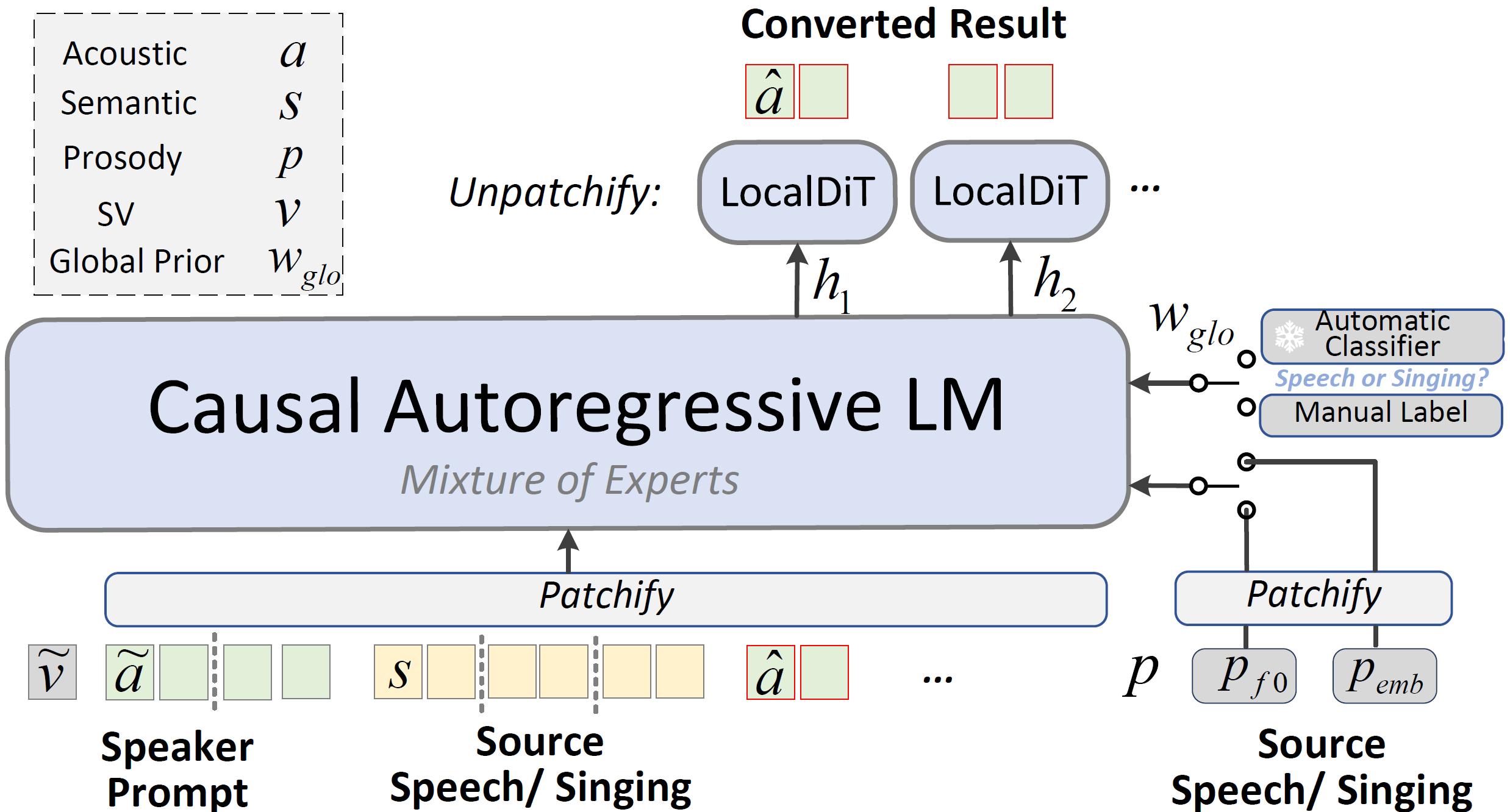 OneVoice is a unified model that supports all three voice conversion scenarios: Linguistic-preserving (LVC), Expressive (EVC), and Singing (SVC).